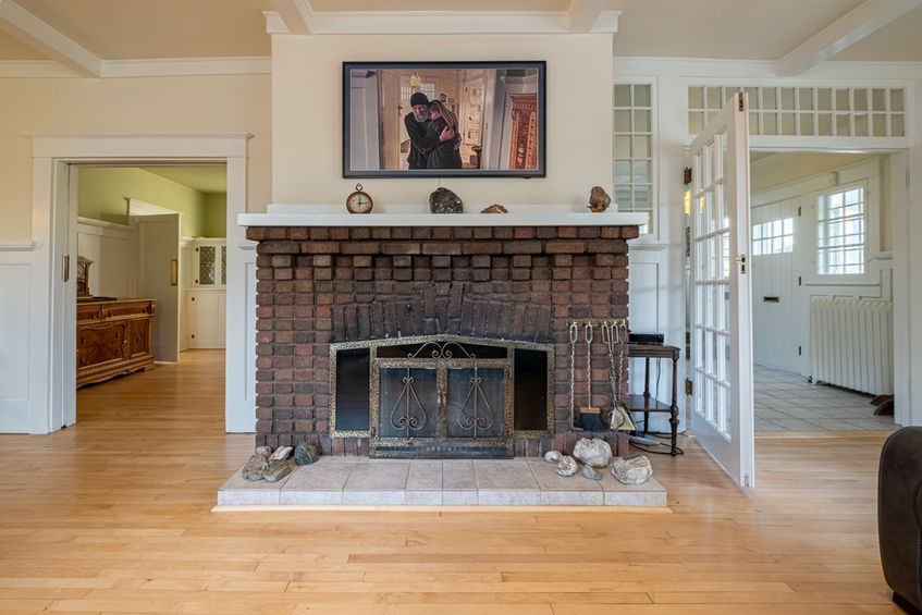 Grand living room with double French doors, brick fireplace, antique wall sconces